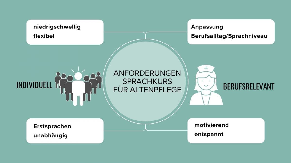 „Wir benötigen einen Sprachkurs für Einzelpersonen und kleine Gruppen in der Altenpflege, der berufsrelevant und kompetenzorientiert ist und wichtige Inhalte bietet, um kommunikative Probleme im täglichen Arbeitsleben zu lösen. Der Sprachkurs sollte unsere Bedürfnisse berücksichtigen und nicht lediglich theoretische Inhalte vermitteln, die im Alltag keine Anwendung finden.“