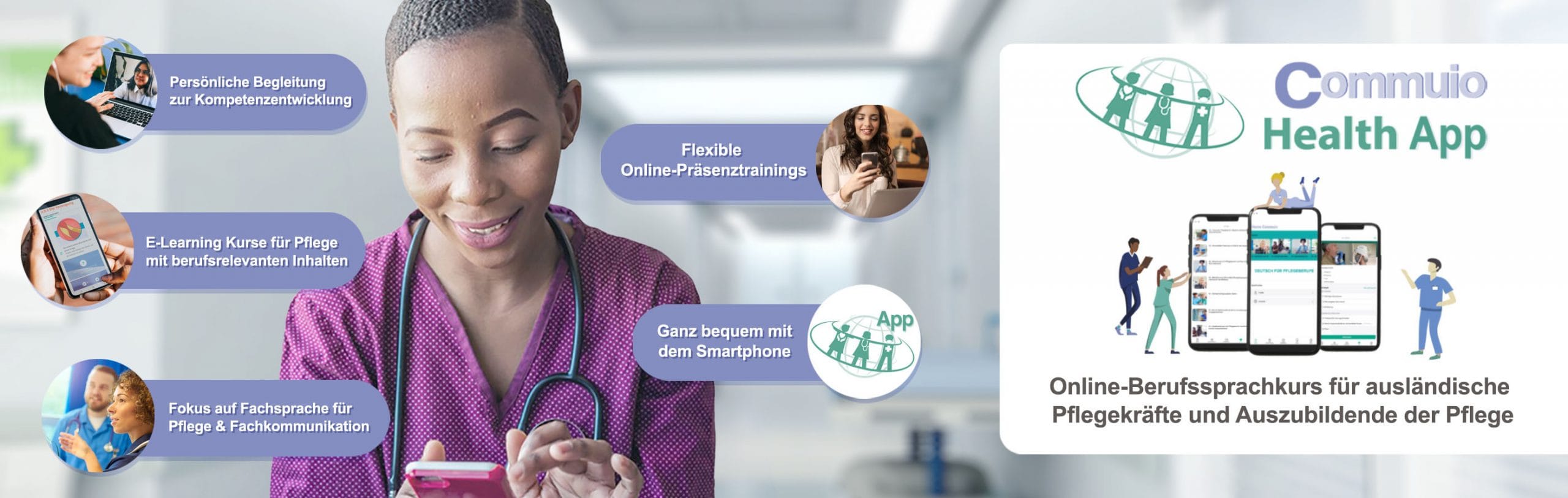 Die Online-Berufssprachkurse für Pflegeberufe der Commuio Health App bieten: